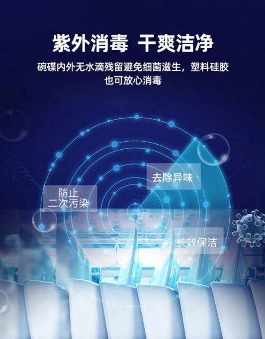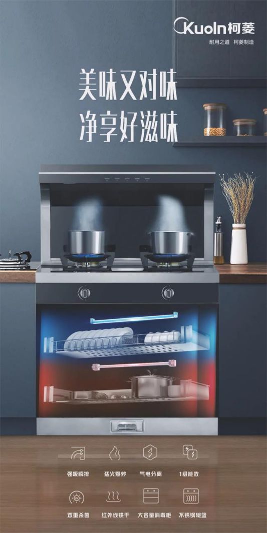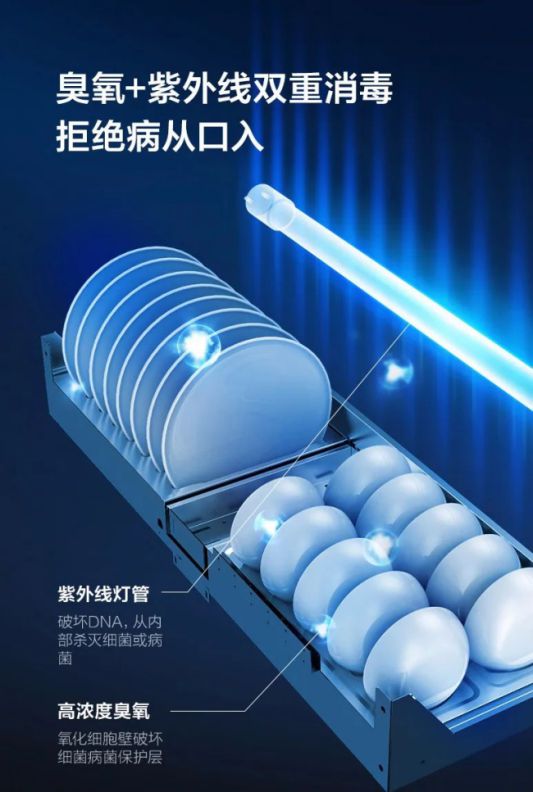 柯菱集成灶設(shè)計了消毒柜紫外線+臭氧雙重消毒功能,大腸桿菌、脊髓灰質(zhì)炎病毒等病菌,給你無菌體驗!
