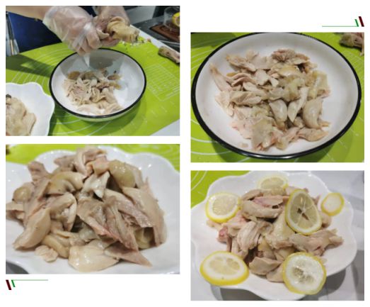 02 雞腿撈出后,放入冷水中降溫,手撕成條狀