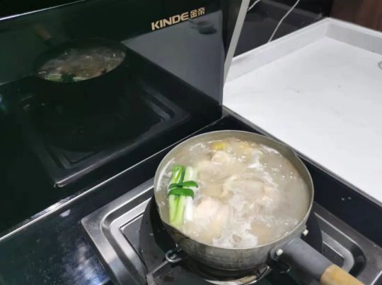 金帝A900ZK2集成灶開火,雞腿冷水下鍋,加姜片、蔥、料酒,水煮半小時,可延長時間直至雞腿熟透