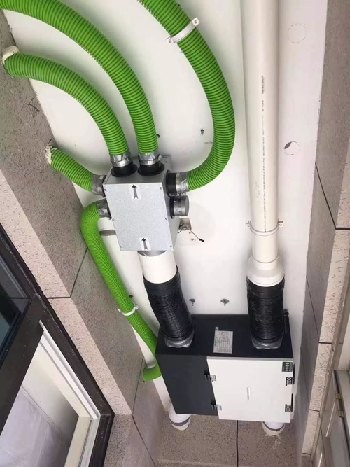 主機安裝在陽臺頂面,從而不破壞整體裝修效果。管道嚴格安裝設計要求,使用分風箱,盡量減少風阻。
