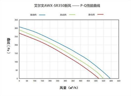 通過上圖可以看出,艾爾文新風系統額定風量350的設備,設備不接管(0Pa)時的風量高達600,當管路阻力達到150Pa時,末端還有超過350的風量,對于使用面積120平米的住宅來說,不管是頂送風設計,或者是地送風設計,都游刃有余,可以保證末端風量的達標。
