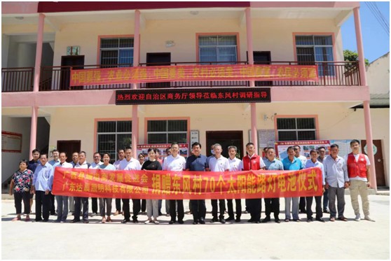 在自治區商務廳的牽線下,廣西縣域電商發展促進會和廣東達晨照明科技有限公司為東風村捐贈了70盞太陽能路燈。此次捐贈的路燈將極大地改善東風村村民的夜晚出行條件,提高了夜間出行的安全指數,也為東風村推進鄉村振興戰略、提升鄉村治理形象帶來了新的發展曙光。