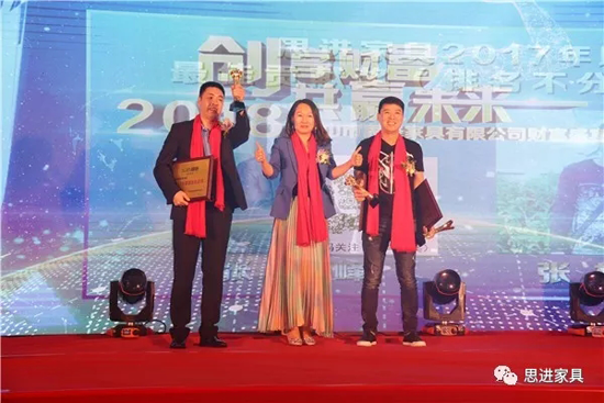 在家具制業這個傳統行業中,思進家具是極富大膽創新思維的典型企業,在過去的2017年中,思進公司董事長廖健程先生首次提出戰略董事新概念,與客戶合作共贏、共享財富,簽約的9名戰略董事客戶中有8名戰略董事獲得豪車獎勵,引起全場轟動!借助2017年成功的喜悅,思進家具簽約行業頂級設計及品牌運營大師許照明先生為思進家具品牌運營顧問、引進最先進、最快速的辦公空間設計軟件、簽約中國最權威媒體CCTV廣告,公司品牌形象全面大升級。這是思進家具發展的又一重大跨越,思進家具將開啟品牌新時代!