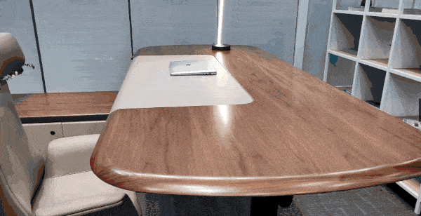 李寧介紹說:“‘橋系列’的設(shè)計(jì)來源,是海太歐林的研發(fā)總監(jiān)在一次差旅中看到的一座橋墩,在此基礎(chǔ)上,我們研發(fā)了一張5.4米長的大型會議桌,它是具有升降功能的。”