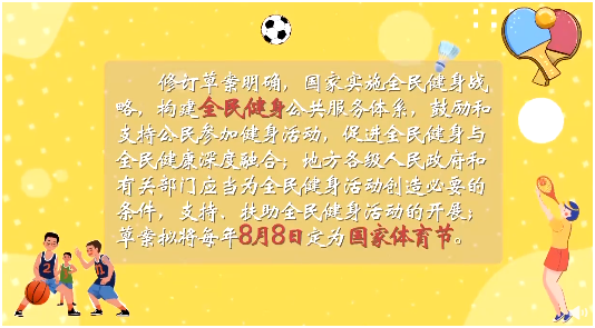 10月19日,《中華人民共和國(guó)體育法(修訂草案)》提請(qǐng)十三屆全國(guó)人大常委會(huì)第三十一次會(huì)議審議。修訂草案明確,國(guó)家實(shí)施全民健身戰(zhàn)略,構(gòu)建全民健身公共服務(wù)體系;學(xué)校必須開(kāi)設(shè)體育課,保證體育課時(shí)不被占用;擬定每年8月8日為國(guó)家體育節(jié)。