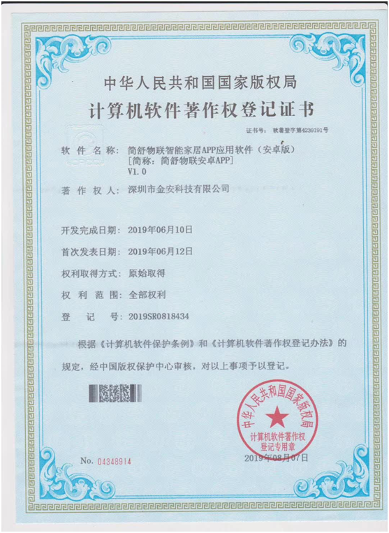 計(jì)算機(jī)軟件著作權(quán)登記證書(shū):簡(jiǎn)舒物聯(lián)智能家居APP應(yīng)用軟件