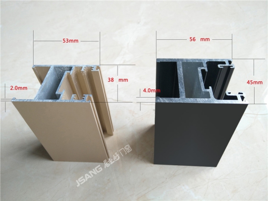 這款推拉門的門扇邊框型材采用了壁厚為2.0mm和4.0mm的航天級鋁材,鋁型材截面大小為38x53mm、 45x56mm真正的窄框全景推拉門!軌道可選平軌或超薄軌。從截面可以看出材料的新鮮純度!表面采用進口氟碳噴涂、還有瓷泳,特點是強度高、抗腐性、抗沖擊、能承受各種惡劣氣候環境。