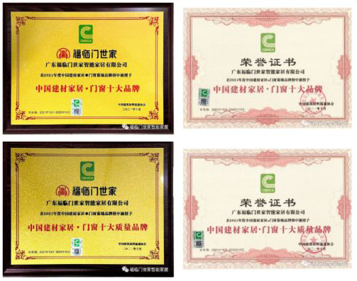 2021年中國建材家居·門窗十大品牌數(shù)據(jù)庫發(fā)布暨表彰儀式。福臨門世家門窗憑借強大的技術(shù)研發(fā)實力、卓越的產(chǎn)品以及雄厚的品牌實力,從眾多知名企業(yè)中脫穎而出,不僅榮獲中國建材家居·門窗十大品牌,還榮獲中國建材家居·門窗十大質(zhì)量品牌。