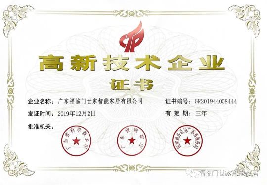 2016年和2019年福臨門世家被認(rèn)定為國家級高新技術(shù)企業(yè)。這一榮譽的取得,標(biāo)志著福臨門世家掌握智能門窗核心技術(shù),開啟福臨門世家智能智造、產(chǎn)業(yè)報國的新篇章。在之后的幾年中,福臨門世家研發(fā)了多款高新技術(shù)產(chǎn)品,產(chǎn)品不僅被評為廣東名牌產(chǎn)品,還獲得PICC中國人民財產(chǎn)保險承保。