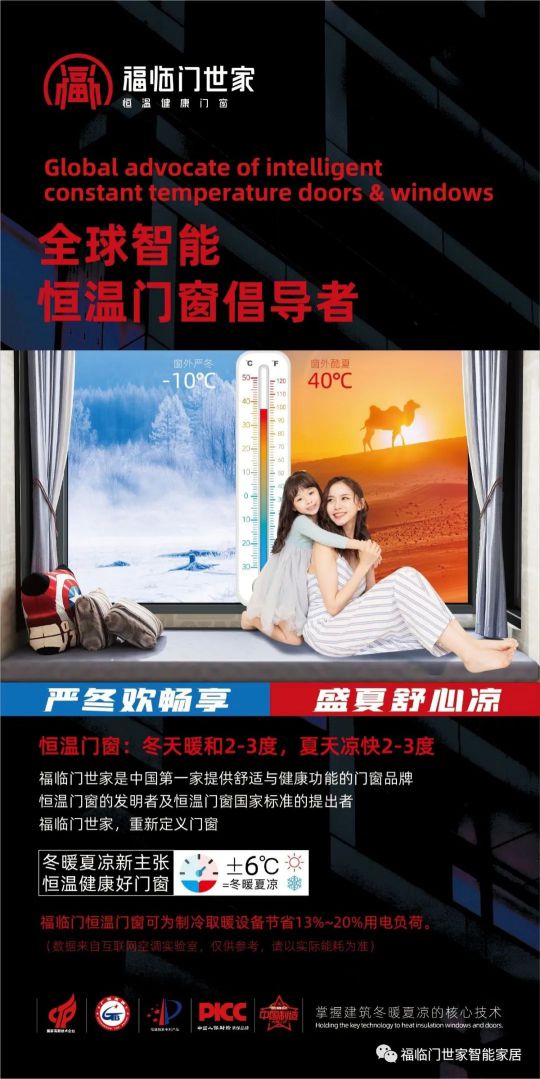 廣東福臨門世家智能家居有限公司是集研發(fā)、設(shè)計、生產(chǎn)、銷售、服務(wù)于一體的節(jié)能門窗專營企業(yè),也是高新技術(shù)企業(yè)。產(chǎn)品榮獲廣東省名牌產(chǎn)品稱號,還獲得PICC中國人民財產(chǎn)保險承保,是全球智能恒溫門窗倡導(dǎo)品牌,恒溫門窗的發(fā)明者及恒溫門窗標(biāo)準(zhǔn)的提出者。