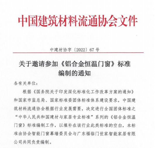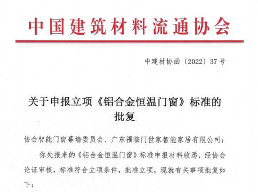 為加快推進綠色制造體系的建設(shè),引領(lǐng)門窗行業(yè)綠色升級轉(zhuǎn)型,助力國家“碳達(dá)峰”、“碳中和”目標(biāo)的實現(xiàn),近日,中國建筑材料流通協(xié)會審批通過了《鋁合金恒溫門窗》團體標(biāo)準(zhǔn)的立項,由中國建筑材料流通協(xié)會智能門窗幕墻委員會與廣東福臨門世家智能家居有限公司共同負(fù)責(zé)編制工作。