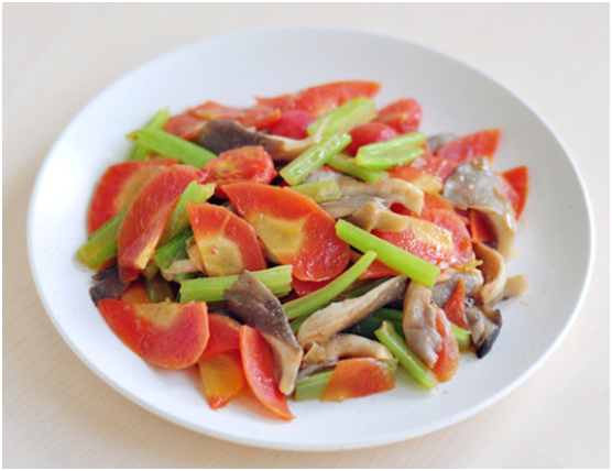這個快手小炒菜,不僅清淡爽口,還含有豐富的維生素。準備西芹、胡蘿卜、蘑菇和小番茄,烹制的次序比較講究,炒鍋燒油,下大蔥炒香后先放胡蘿卜翻炒片刻,放蘑菇翻炒,放芹菜段繼續翻炒(放一點點生抽,既去除蘑菇的腥味又可讓芹菜入味),最后放入小番茄翻炒至出水即可。