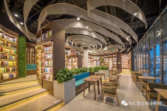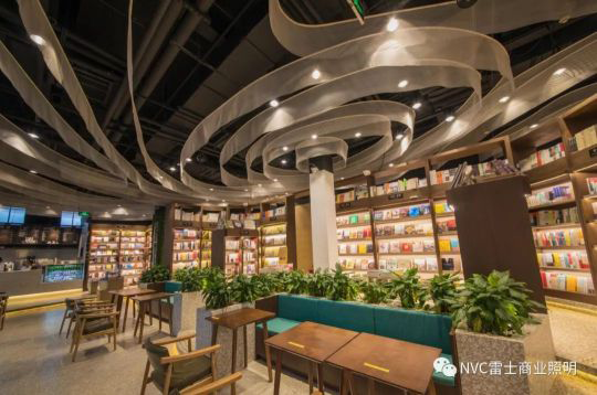作為市民服務中心的商業配套存在的中信書店,成為園區智慧運營、人文關懷的亮點。中信書店燈光運用緊緊圍繞室內裝飾,采用LED垂直筒燈照明,分布于螺旋形薄紗造型之間,保證了均勻的照明效果,又弱化了凌亂突出的天花視覺效果,反而營造出朦朧光輝的整體感。