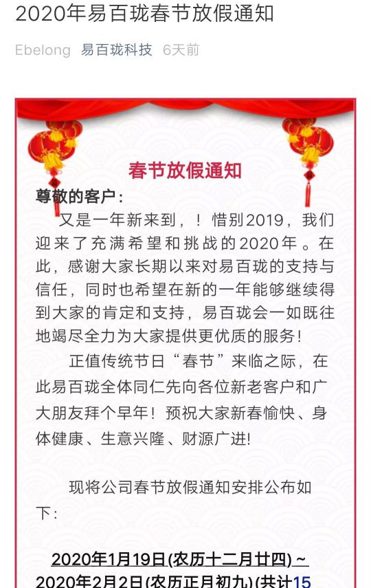 易百瓏在通知中表示,放假期間,公司正常接單,新老客戶如有相關需求請直接聯系公司相關負責人,收假后(2020年2月6日)恢復正常生產流程。