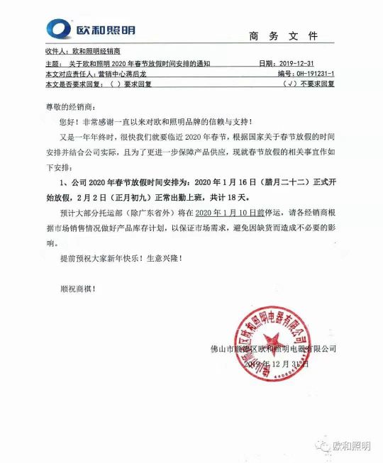 2019年12月31日,佛山市順德區(qū)歐和照明電器有限公司發(fā)布《2020年春節(jié)放假通知》稱,2020年春節(jié)已經臨近,根據國家關于春節(jié)放假的時間安排并結合公司實際,且為了更進一步保障產品供應,歐和照明現就春節(jié)放假的相關事宜作如下安排: