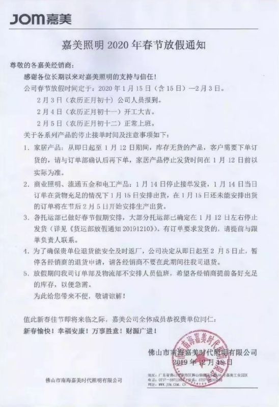 2019年12月18日,佛山市南海嘉美時代照明有限公司公布了《2020年春節(jié)放假通知》。通知顯示,嘉美照明春節(jié)放假時間定于2020年1月15日(含15日)—2020年2月3日。