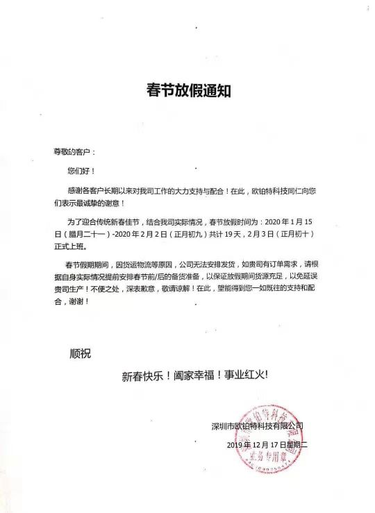 2019年12月17日,深圳市歐鉑特科技有限公司發(fā)布《春節(jié)放假通知》稱,歐鉑特春節(jié)放假時間為2020年1月15日(臘月二十一)—2020年2月2日(正月初九),共計19天;2月3日(正月初十)正式上班。