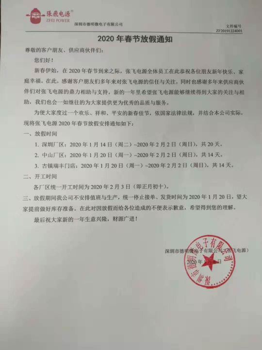 1月6日,深圳市德明微電子有限公司(張飛電源)發(fā)布《2020年春節(jié)放假通知》。通知顯示,張飛電源不同廠區(qū),放假時間有所不同,但開工時間統一為2月3日。