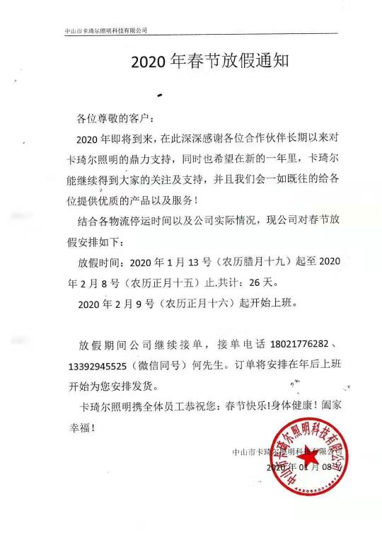 1月8日,中山市卡琦爾照明科技有限公司公布其“2020年春節(jié)放假通知”。據通知顯示,結合各物流停運時間以及公司實際情況,卡琦爾決定于 2020年1月13號(農歷臘月十九)至2020年2月8號(農歷正月十五)放假,共計26天。