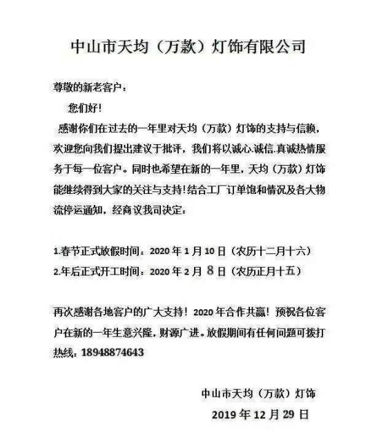 2019年12月29日,中山市天均(萬款)燈飾有限公司公布春節(jié)放假時間安排。天均燈飾表示,結合工廠訂單飽和情況及各大物流停運通知,經商議,公司決定如下: