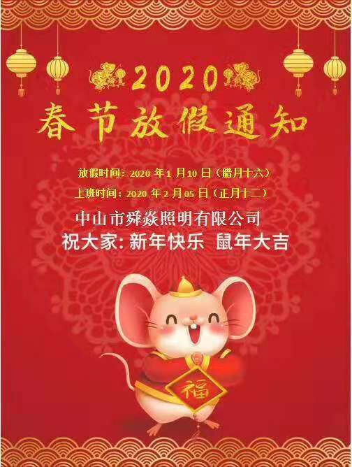 中山市舜焱照明有限公司通過一張海報公布了舜焱照明“2020春節(jié)放假安排”。據海報顯示,舜焱照明放假時間為2020年1月10日(臘月十六);上班時間為2020年2月5日(正月十二)。