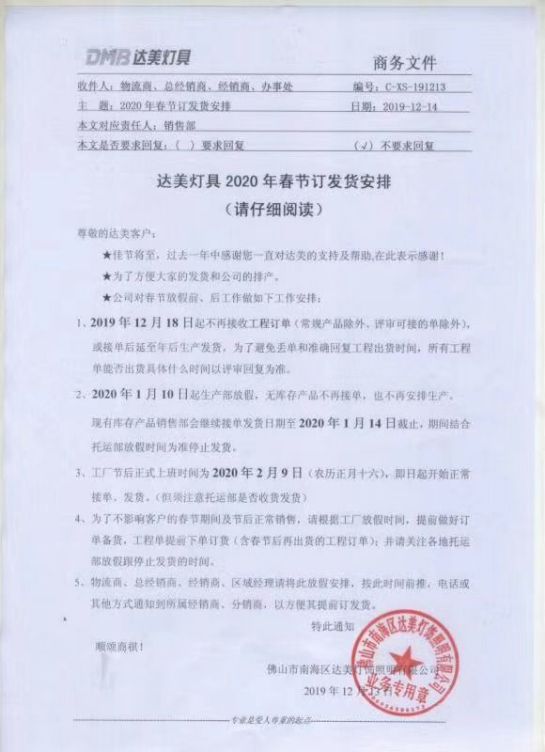 2019年12月13日,佛山市南海區(qū)達美燈飾照明有限公司公布企業(yè)2020年春節(jié)訂發(fā)貨安排。據通知單顯示,達美燈具2019年12月18日起不再接收工程訂單(常規(guī)產品除外、評審可接的單除外),或接單后延至年后生產發(fā)貨。為了避免丟單和準確回復工程出貨時間,所有工程單能否出貨具體什么時間以評審回復為準。