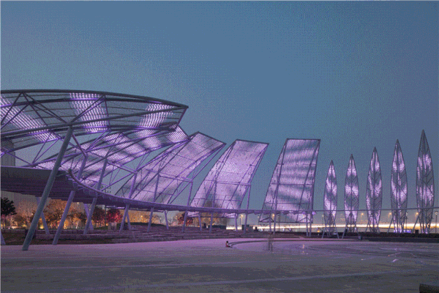 園內太極廣場的鋼架雕塑造型獨特,密布的點狀光源,以點成面變換著別樣色彩,為廣場增添動態之美。