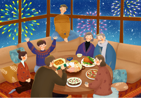 觥籌交錯,推杯換盞;氣氛高漲,興致勃勃!大家聊著從前的趣聞,談著未來的計劃,談笑風生直至深夜。窗外璀璨的煙火與屋內(nèi)明媚的燈光交相輝映,營造出溫暖且動人的氛圍!