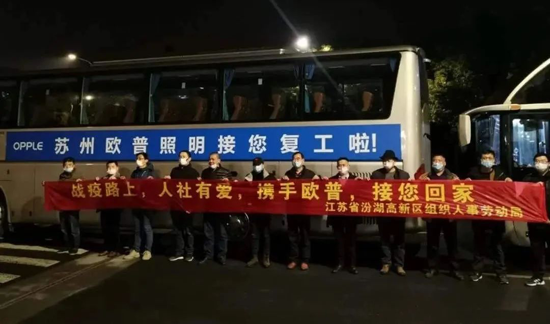 “攜手歐普,接您回家”,蘇州歐普照明接員工復工。