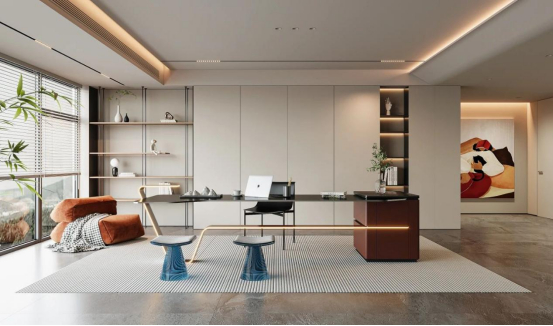 書房燈光設(shè)計,講究使用大量較低色溫光源,通過重點與非重點區(qū)域的明暗對比,營造出合適的閱讀氛圍。