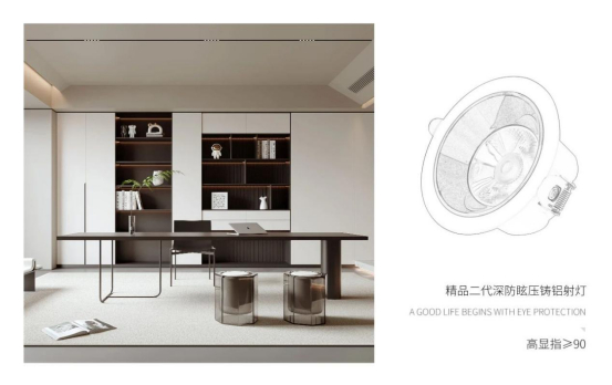 【開爾照明精品二代深防眩壓鑄鋁射燈】深藏光源結(jié)構(gòu)設(shè)計,大遮光角避免眼睛直視燈光帶來的眩暈感、刺眼感,給眼睛最佳的舒適感覺。再以極窄邊框嵌入式安裝與整個空間結(jié)合起來,井然有序,彰顯書房的嚴(yán)謹(jǐn)性和專業(yè)性。