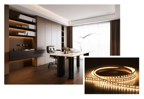 有強(qiáng)有弱才能稱之為重點,所以不是放一盞燈就能成為重點的。為了不喧賓奪主,書房其他區(qū)域的用光就一定要克制。所謂克制,可以視為補(bǔ)充用光,補(bǔ)充用光的關(guān)鍵字是“柔”,開爾照明【精品系列低壓燈帶】90高顯指,無頻閃無藍(lán)光,書房補(bǔ)充光非它莫屬。