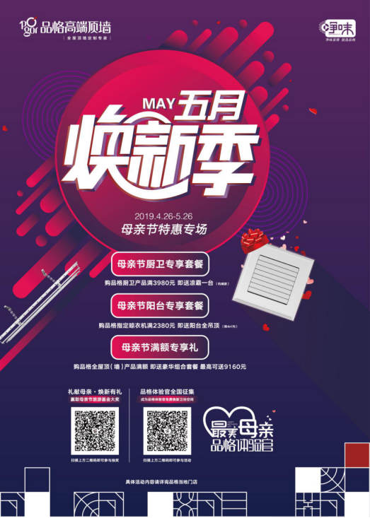 恰遇五月母親節來臨之際,特別推出“五月煥新季,母親節特惠轉差活動”,多重豪禮統統獻上。在4月26日-5月26日活動期間:,只需在品格活動門店購廚衛產品組合滿3980元,就送品格涼霸一臺,掃空浴室悶濕,干爽一夏。