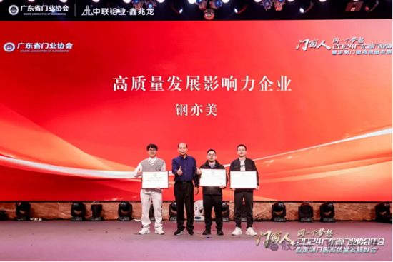 在此次年會中,鋼亦美門業憑借多年來對產品質量的嚴格把控、持續的技術創新以及在市場上樹立的良好口碑,獲得了高質量發展影響力企業獎。鋼亦美始終堅持“以質量求生存,科技為先導,憑創新謀發展”的經營理念,匯聚專業人才與高級工匠技師,采用先進的生產設備和獨特的工藝技術,從前期定制設計到后期生產制造,嚴格把控每一個環節,確保產品精細的品質,其產品以簡約的設計、精湛的工藝、穩定的質量品質、優越的防盜性能及合理的價格和完美的售后服務在同行中獨樹一幟,深受廣大經銷商和用戶的一致好評。