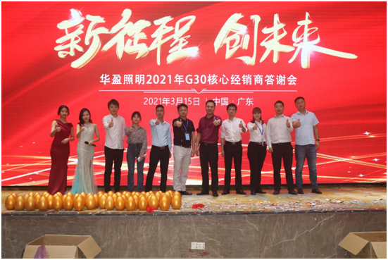 2021年3月15日,華盈照明2021G30核心經(jīng)銷商答謝會(huì)在企業(yè)總部——廣東中山隆重舉行!華盈照明總部拿出品質(zhì)產(chǎn)品及政策誠意力邀核心經(jīng)銷商蒞臨現(xiàn)場(chǎng),共同為華盈照明2021年的品牌推廣及市場(chǎng)發(fā)展出謀劃策。