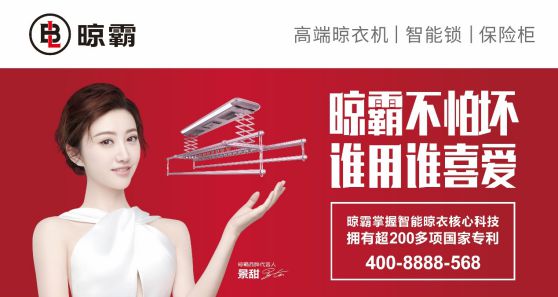 作為中國家居行業的品牌名片,成立13年來,晾霸一直致力于“為全球家庭提供高端智能晾衣機”,是智能晾衣機行業標準制定單位,更是掌握智能晾衣機核心科技的全球化企業。2016年,晾霸簽約國際明星景甜,品牌榮耀升級。