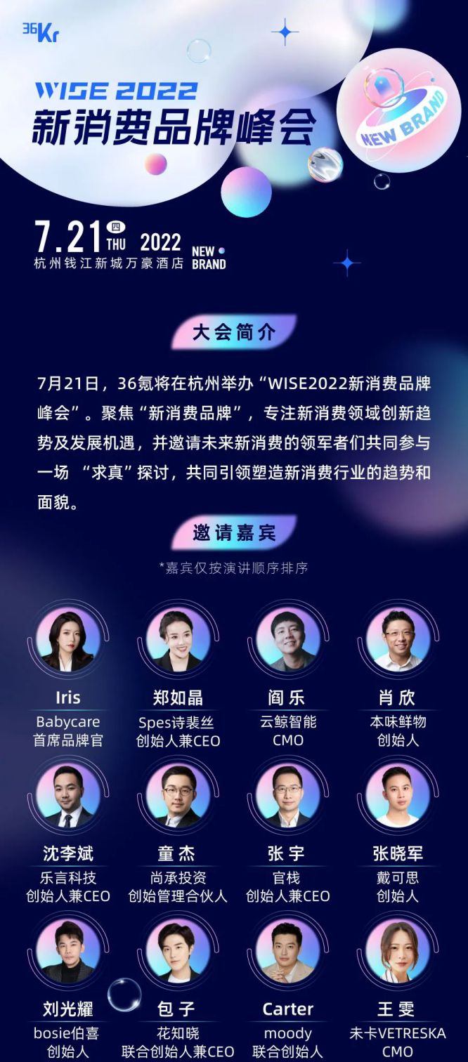 7月21日,36氪“WISE2022新消費品牌峰會”將在杭州錢江新城萬豪酒店舉辦,36氪邀請到了30+知名投資機構、電商平臺、品牌方和服務商的高管們一起來探討新消費的發展與機遇。