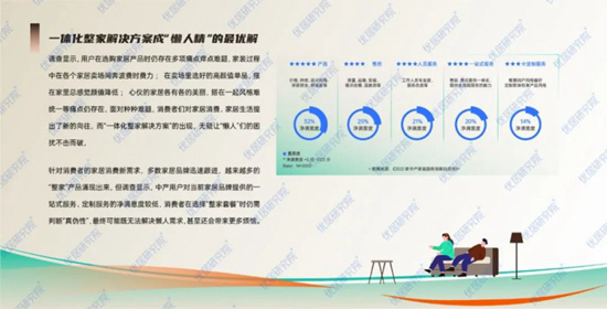 調查顯示,用戶在選購家居產品時仍存在多項痛點癢點難題,家裝過程中在各個家居賣場間奔波費時費力;在賣場里選好的高顏值單品,擺在家里總感覺顏值降低;心儀的家居各有各的美麗,搭在一起風格難統一等痛點仍存在,面對種種難題,消費者們對家居消費、家居生活提出了新的向往,而“一體化整家解決方案”的出現,無疑讓“懶人”們的困擾不擊而破。
