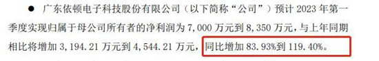 依頓電子 亦表現優異。公司預計,2023年第一季度實現歸屬于母公司所有者的凈利潤為7000萬元至8350萬元,同比增長83.93%至119.40%。 依頓電子表示,報告期內,公司聚焦汽車電子和新能源兩大核心主業,進一步加強市場開拓,銷售收入同比有所增長。