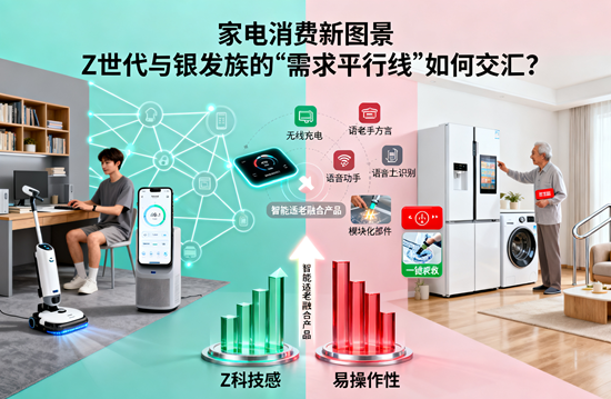 當00后小李用手機語音指令啟動掃地機器人時,65歲的張阿姨正在社區(qū)活動中心學習用智能電飯煲預約煮粥。這兩個看似平行的生活場景,正勾勒出中國家電市場最鮮活的消費圖譜——Z世代與銀發(fā)族,這兩個年齡跨度超過40年的群體,正在用截然不同的方式重塑家電行業(yè)。他們就像兩條并行不悖的軌道,既保持著各自的運行邏輯,又在數(shù)字化浪潮中悄然靠近。