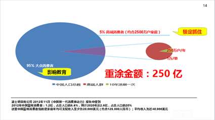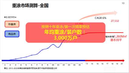 立邦今年正式推出制造商轉型成為完整解決方案的服務商,通過四年來的總結,以前生產涂料、賣涂料,現在有很多內容要做,是整體的服務,是我們從免費的質檢到制訂方案、再到怎么解決的過程。這個是量,我們國家按照13億人口來說,大概有3億戶的家庭,如果按十年重裝一次的話,每年有3千萬戶的需求。如果我們把5%的高端人群列出來,那么每年大概有250萬戶重涂,按每單一萬來算,重涂的金額是250億,這是高端人群,中低端的人群還沒有算,如果算進去這個量要大很多。