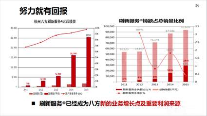 這個雖然我第一個做,在浙江我做的算大的。但是在全國來說,比我做的大的有很多人,像北京王總一個月做700單,上海一個客戶最多一天做1100萬。第一年我們做了76萬,第二年我們做了313萬,第三年做了572萬,第四年做了1616萬,今年預計是2550萬左右。去年三月份在湖南長沙的會議上,我說我這個月到25、26號的時候做了80多萬,去年三月份做80多萬感覺很了不起,結果在第二個月份我們就做了250萬,今年的7月份做到342萬。我大概跟大家透露一下做這個刷新的凈利潤可以達到25%。我們的重涂已經做了四年,明年我們的目標是3千單,每年保持70%-80%的增長,現在除了互聯網泡沫的東西,傳統行業保持70%-80%增長的行業不太有,所以真的希望大家去認真的了解。