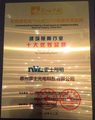 雷士憑借多年來在照明領域的辛勞耕耘,以過硬的產品質量、優秀的產品服務、先進的產品技術、高端的品牌形象榮獲“影響中國智能建筑電氣行業2015年度十大優秀品牌(建筑照明行業)”。