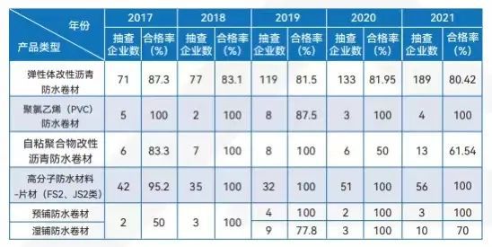 2017-2021年建筑防水卷材產(chǎn)品抽查統(tǒng)計表