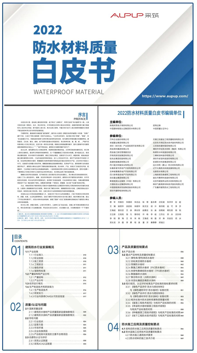 考慮到防水材料在建筑工程中的重要性,珠海采筑電子商務(wù)有限公司聯(lián)合中國建材檢驗認(rèn)證集團蘇州有限公司等機構(gòu)和其他多家知名防水企業(yè),經(jīng)多次研究討論,共同編寫《2022防水材料質(zhì)量白皮書》,以服務(wù)人類健康美好生活為愿景,幫助從業(yè)者了解防水材料,理解建筑防水功能,正確合理地設(shè)計和選材,指導(dǎo)防水施工和應(yīng)用,助力防水行業(yè)供給側(cè)轉(zhuǎn)型升級和高質(zhì)量發(fā)展。