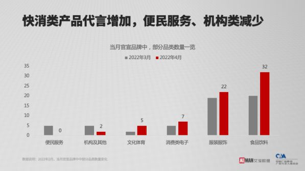 從品類上看,2022年4月,服裝服飾、食品飲料等品類的代言數量增加,超過了3月。而便民服務、機構類代言不升反降,官宣數量低于3月。