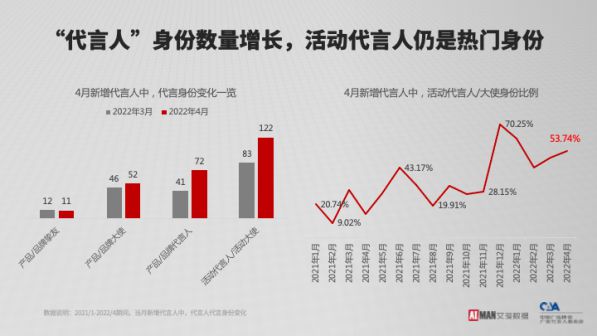 不過,“短平快”的輕量級代言方式,仍然是很多品牌的選擇。在4月新增的代言中,有53.74%都是“活動代言人”或“大使”身份,數量也從3月的83人次,增長到4月122人次。