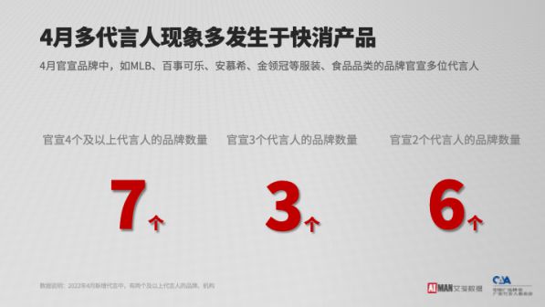 因此,一品牌邀請“多星”代言的現象在4月更為明顯,代言人/品牌比例達到1.97,平均每個品牌幾乎要邀請2位代言人。