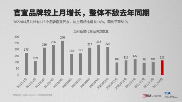 2022年4月,代言市場官宣數量稍有上漲,共115個品牌有新增代言官宣,這一數量與去年同期相比有51%的下降,但比前幾個月還是有明顯回升。