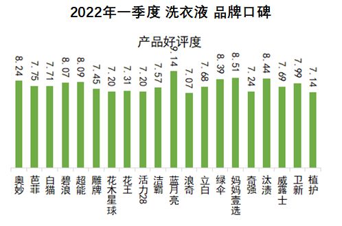 產品好評度方面,藍月亮、媽媽壹選、汰漬位居前三。綠傘、奧妙、超能、碧浪、衛新、芭菲、白貓分列第四至第十位。